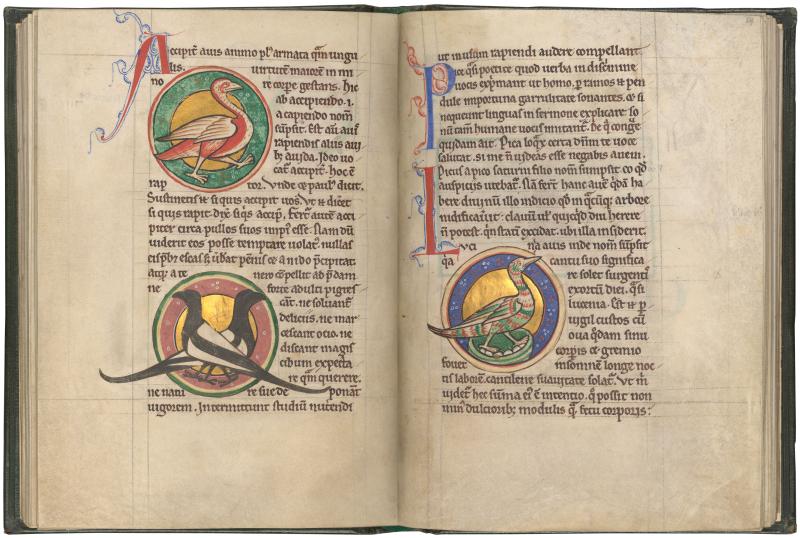 The hawk in this green and gold medallion is described as a stern parent who forces its chicks to hunt from an early age. Below, a pair of magpies known for their “rude prating” extend their tails into the text and margin.