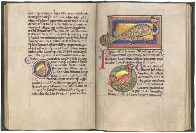 This peacock may reflect comparisons of the bird with tail open to prideful preachers, and the advice offered by bestiaries that the peacock “keep its tail down.” Below, a cock illustrates a description of the power of the cock’s crow, thought to calm storms and frighten robbers.