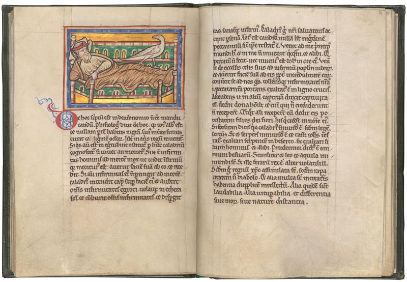 The pure white caladrius bird turns away from a sick person when he is going to die, but if, as here, the bird looks directly at him, it takes on the person’s sickness and burns it off in the sun, thus curing the sufferer.