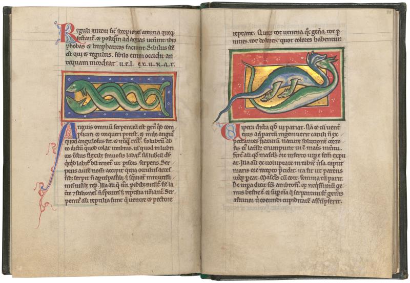 Two intertwined serpents introduce an entry on the general qualities of snakes: their bending, shadowy, slippery, poisonous natures.