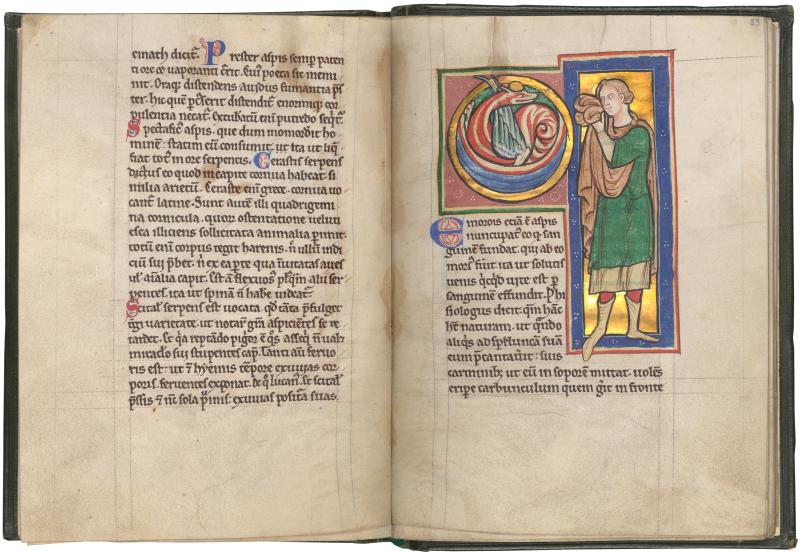A covetous man uses the folds of his mantle to try to steal the golden carbuncle guarded by the deadly emorrosis, whose venom makes its victims sweat blood.