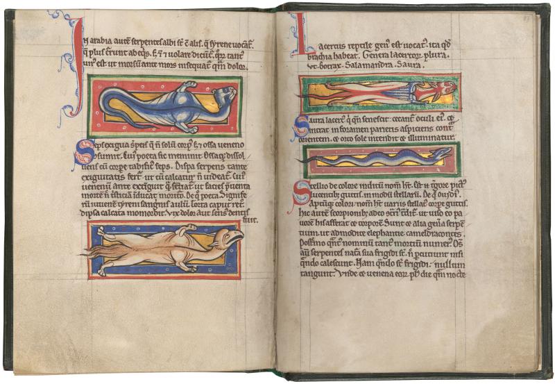 Above is a winged saura: a lizard, which can cure its blindness by gazing towards the rising sun through a crack in a wall. Below is the stellio, a type of spotted newt.