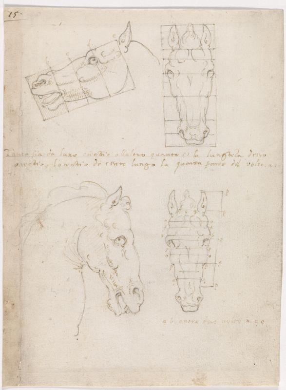 Upper half: Head of a horse in profile, turned to the left, and front elevation of the same head; Lower half: Head of a horse in profile, turned to the right, and front elevation of the same head