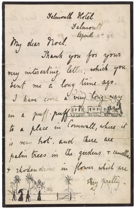 This is Potter's earliest known picture letter, written to Noel Moore when he was four years old. It describes a holiday trip to a seaside resort in language easily understandable at his age with illustrations that might pique his interest and retain his attention. Note the passage in square brackets (at the bottom of the third page) cautioning his mother about seashells she proposed to give him and his younger brother.