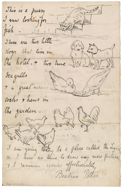 This is Potter's earliest known picture letter, written to Noel Moore when he was four years old. It describes a holiday trip to a seaside resort in language easily understandable at his age with illustrations that might pique his interest and retain his attention. Note the passage in square brackets (at the bottom of the third page) cautioning his mother about seashells she proposed to give him and his younger brother.