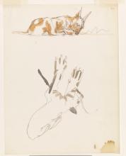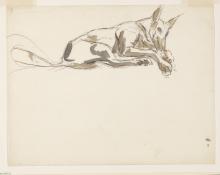 Un chien ou renard couché devant une esquisse de terrier [drawing].