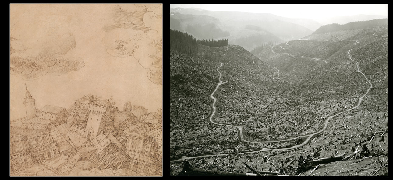 Left: Domenico Campagnola (Italian, ca. 1500-1564), Apocalyptic Scene with Fallen Buildings, ca. 1550. Pen and brown ink. Thaw Collection