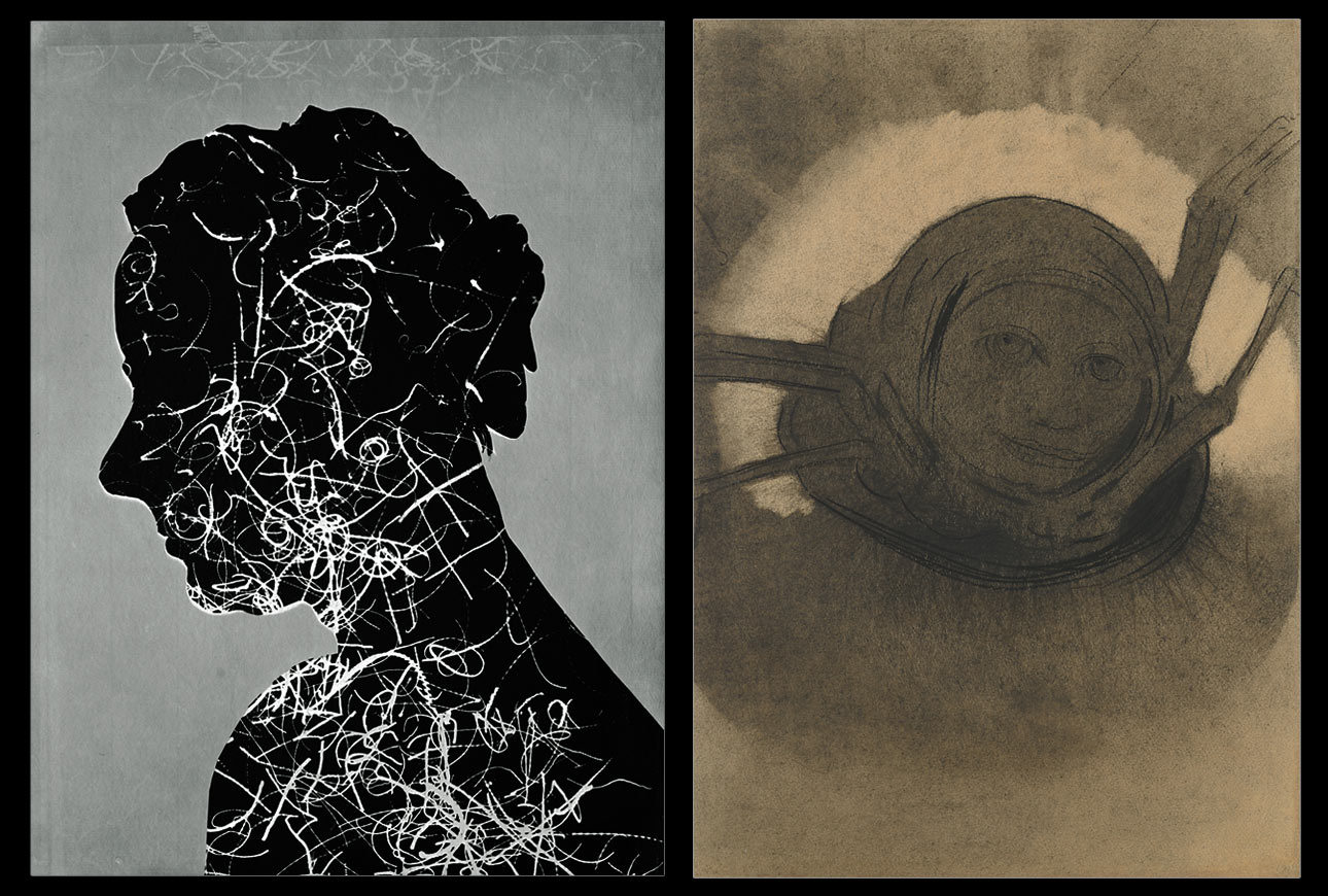 Right: Odilon Redon (French, 1840-1916), The Spider, 1902. Charcoal and black chalk. Thaw Collection
