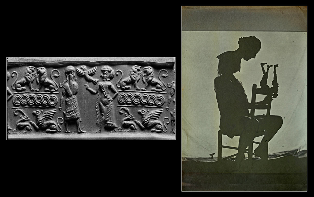 Left: Male Figure before a Goddess Drawing Aside Her Mantle, Syria, ca. 1720-1650 BC. Cylinder seal: hermatite. Acquired by Pierpont Morgan between 1885 and 1908, Morgan Seal 945