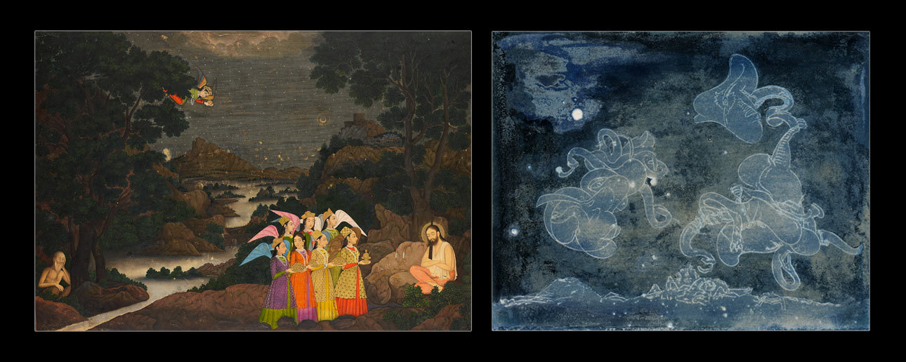 In Mir Kalān Khān’s manuscript illumination of an ascetic in the wilderness, the brightly colored wings of attendant angels contrast with the moonlight tones that prevail in the scene around them. Khan's composition may be derived from portrayals of Christ being fed by angels during his forty days in the wilderness.
