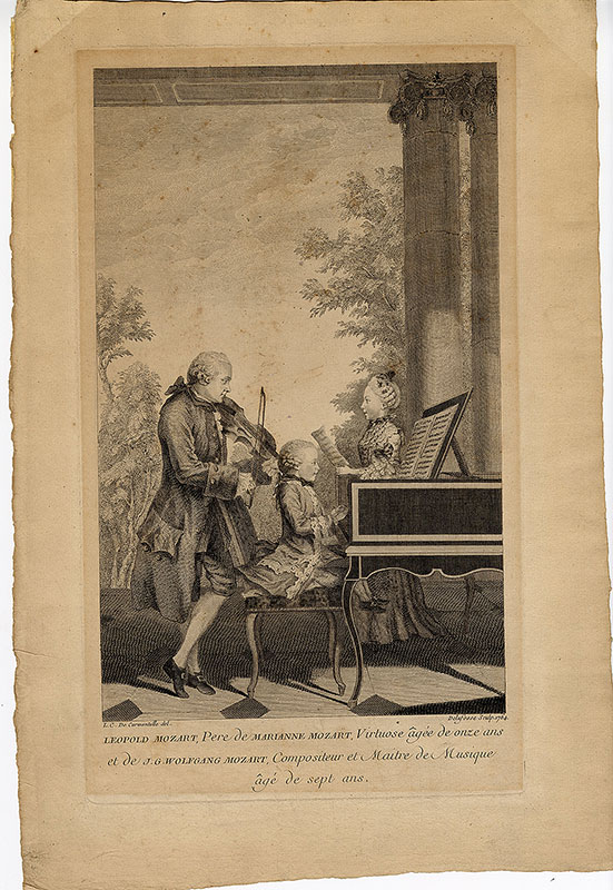 This 1764 engraving by Jean-Baptiste Delafosse is perhaps the most recognizable image from Mozart’s early childhood. Engraved after a watercolor by Louis Carrogis de Carmontelle, it depicts the young composer in performance with his sister, Maria Anna, and father, Leopold, during the family’s stay in France, where they played for King Louis XV’s court. The Mozarts sold prints as souvenirs as they continued their Grand Tour through 1766. According to a note on the back of this copy, it was acquired in Dunkirk in early August 1765, when the Mozart family was returning to Paris after spending fifteen months in London, performing for both royalty and everyday citizens.