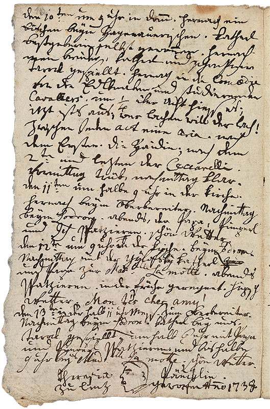 Maria Anna “Nannerl” Mozart kept a diary from 1775 to 1783. While still living at home in Salzburg, her brother Wolfgang occasionally added his own notes to its pages, filled with the events of his days sprinkled with witty observations, sometimes obscure word play, and scatological humor. Mozart also added a small caricature of Therese Pänklin, a versatile servant employed by the family after their move to the more spacious apartment in the Dancing Master's House (Tanzmeisterhaus) (now the Mozarteum’s Mozart Residence museum). It may seem surprising that Leopold Mozart, on his modest salary as deputy Kapellmeister at the Salzburg court, could afford domestic staff. Yet even before Wolfgang’s birth, Leopold employed a maid to assist his wife with household duties, and throughout the family’s years in Salzburg—until Leopold’s death in 1787—the Mozarts retained two servants. During the family’s Grand Tour of 1763–1766, they traveled with two uniformed attendants. Later, in Vienna during the 1780s, Mozart himself employed up to six servants, as well as music copyists, a piano tuner, and three piano movers.