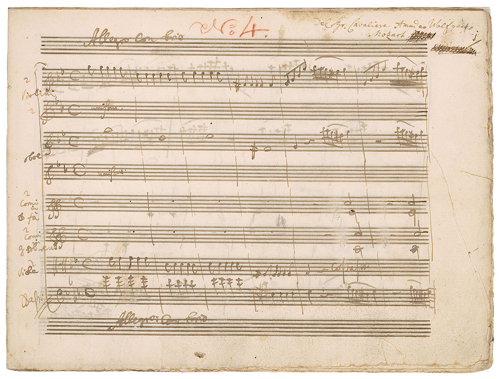 These nine symphonies were composed by Mozart between 1773 and 1774, after he and his father returned to Salzburg following their third Italian tour. The manuscripts were once bound in a book by Leopold Mozart. His hand-written contents page lists each work along with details of its scoring and the opening bars from its first movement. Written when Mozart was seventeen and eighteen years old, all nine are superb, but two stand out as masterworks fundamental to the modern repertoire: No. 25 (K. 183), the first of Mozart’s two great G- minor symphonies, and Symphony No. 29 in A Major (K. 201). These are composing manuscripts, not later fair copies, yet they are written in a confident, fluent hand, with few corrections. This is typical of Mozart—he often had his ideas well worked out before putting pen to paper.