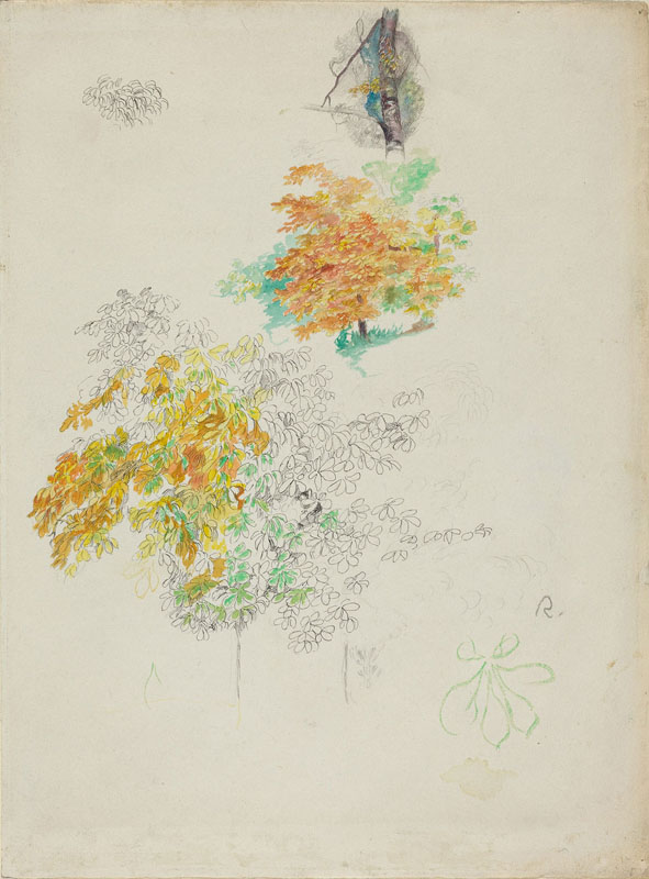 Renoir made this carefully detailed drawing in a sketchbook as he sat outdoors studying a tree, perhaps in the late summer when some of the leaves had begun to turn yellow and gold. One vignette gives an overall view of the tree, the next zooms in for a closer look at the foliage, some of which is simply outlined in pen and ink, and several other sketches focus in even more closely, capturing the dark, glimmering quality of the bark and the characteristic profile of a single, multi-lobed leaf outlined in green. Renoir used this technique of creating graphite or pen and ink outlines which he then filled in with watercolor primarily in the mid-1880s, when he wanted to follow more rigorous drawing practices. Such sketches served as notations that he could execute relatively quickly on the site and then take back to his studio for future reference. As he wrote in a letter to his dealer Paul Durand-Ruel in August 1886, when he was staying in Brittany for the summer: “I have some fine things here to work on until the end of September, but I’m making drawings and watercolors so that there will be no shortage of material for me to use this winter.” Many of his watercolors of the later 1880s— several of which are displayed nearby—are executed with broader, more fluid handling, often depicting an overall view of a site. When a group of these various watercolors was exhibited in Paris in 1921, one critic described Renoir’s technique as taking “multiple repeated touches, woven together, to obtain stunning vibrations. ... With such a limited range [of colors] he achieves the rarest of harmonies”— an apt description of the artist’s light- and color-filled landscape drawings.