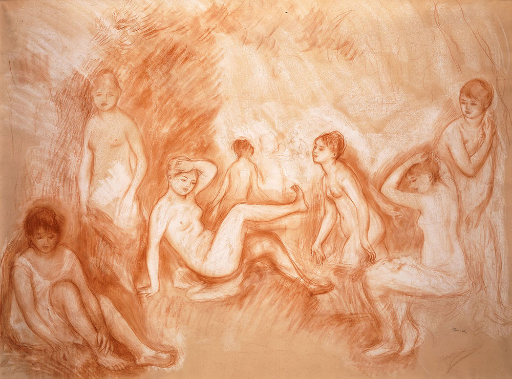 In 1897 Renoir revisited the subject of bathers interacting playfully in a woodland setting, some ten years after he completed his landmark canvas The Great Bathers. This sketch is one of many new preparatory studies that recombine figures from earlier works—the central reclining woman and the one about to splash her derive directly from The Great Bathers, while the seated bather on the right arranging her hair relates more closely to other images of individual models. Although this roughly drawn study and the more fully worked-up sheet next to it share the same six main figures, they differ considerably from the final painting in the Barnes Foundation, Philadelphia.