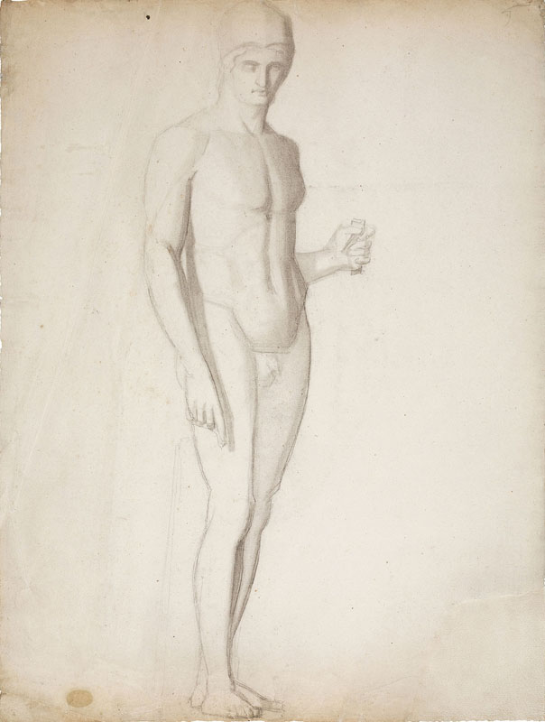 It might seem surprising that these two carefully drawn studies of classical sculptures were made by Renoir. In fact, this sheet and the one next to it—along with the sketchbook pages displayed in the case—are among his earliest surviving drawings. They were probably made after he had been a student at a free municipal drawing school in his neighborhood, and around the time he entered the national art school, the École des Beaux-Arts. In 1860 Renoir was granted permission to make drawings of art in the Louvre, and, in accordance with traditional teaching methods, he copied classical Greek and Roman sculptures to learn how to depict human anatomy. Both the Richelieu Mercury and the Borghese Mars are Roman marble sculptures of the first or second century that were seized or forcibly purchased, respectively, in Italy during the French Revolution and the Napoleonic period to enhance the rapidly growing classical antiquities collection of the Louvre. They were very well known in Renoir’s time. The simplified contours and shading of his drawings reflect both the idealized forms of the sculptures and the precepts of his drawing teacher, who encouraged students to start by outlining basic shapes and then adding detail, and to use soft shading rather than sharp crosshatching to model three-dimensional forms. These two student drawings were among a group of related studies that remained in Renoir’s family and were inherited by his nephew. They were virtually unknown until 1982, when they were sold to another private collection, and have not been on public view since.