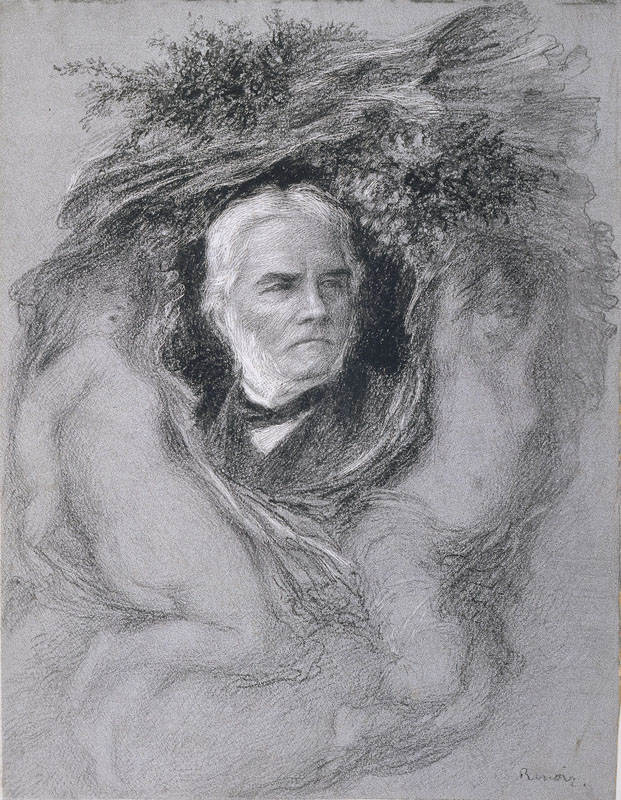 In 1879 Renoir became a contributing illustrator to the new literary and artistic journal La Vie moderne. This portrait of fellow artist Léon Riesener (1808–1878), who had died a year earlier, was Renoir’s first contribution. Because of the technological limitations of photomechanical reproduction at the time, Renoir had to use a heavy paper prepared with a pre-printed matrix of black ink dots, on which he could add dark lines or scratch away white lines. Although he complained about the difficulty of the technique, he successfully captured Riesener’s likeness, and he made several more drawings of this type.