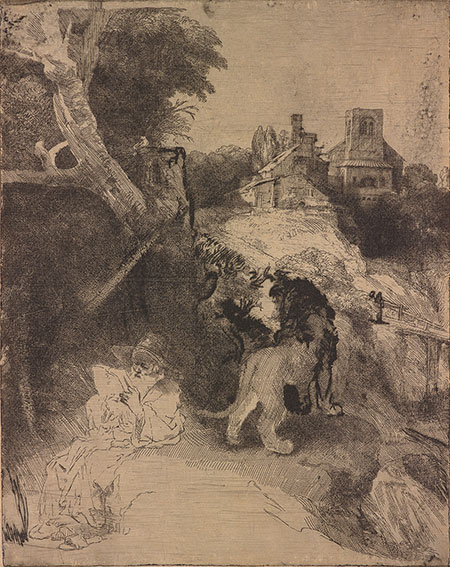 Rembrandt van Rijn. St. Jerome Reading in an Italian Landscape, ca. 1653. Etching and drypoint, printed on Japanese paper, 259 x 210 mm. Purchased by J. Pierpont Morgan in 1905. The Morgan Library & Museum (RvR 165).