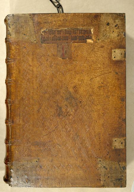 Vols. I, II, & IV: 15th-century German blind-stamped pigskin over wooden boards (49 x 35 cm), sewn on 7 supports, probably bound by the Biberach Kartäuser workshop (EBDB w004209); only tooled on the top covers. Metal corner and center pieces removed and 2 clasps missing per volume (some catch plates still present). Vol. I with German manuscript waste as rear endleaf, incomplete legal text mentioning a "Conrad Kaczenberger und Kathreyen sein Tochter" with references to Nuremberg, Langenstadt, and a house on the Judengasse in Kulmnach (Kulmbach?). Vol. I with paper shelfmark label: I (front board); II with shelfmark: I, and title labels (front board), title label missing metal frame; IV with paper shelfmark label: I (front board). Vols. I, II, and IV with chain attached to upper edge of rear board.