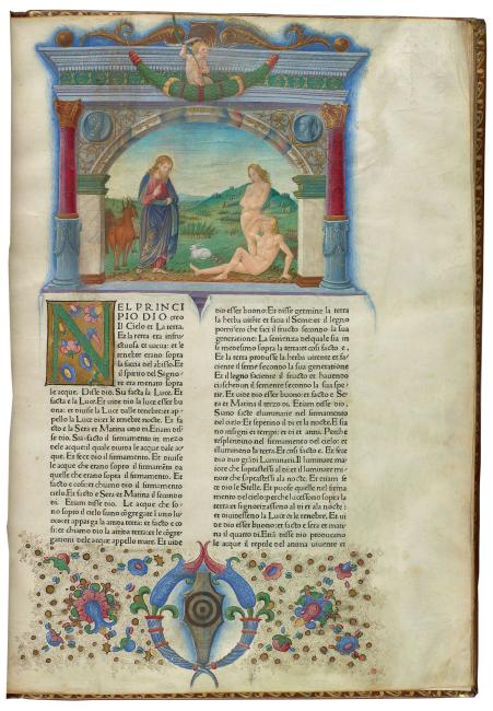 Vol. I (PML 26983). Hand decoration: Contemporary Venetian illumination and rubrication, scene depicting the Creation of Eve in architectural framework with putto above holding a scroll: "sola virtute," and foliate bad-de-page decoration with armorial (leaf [2]/1r) and foliate illuminated initials by the Master of the Putti; alternating red and blue initials and paragraph marks, red rubrics, headlines, and Roman numeral foliation. The rubrics, headlines, and foliation are in the same hand in both volumes, although the initials are likely by different artists. Annotations: A few contemporary marginal notations in text, including 2 textual corrections in Psalms. A manuscript quire [*⁴] added between quires [27-28] with a table for the Psalms; in a similar hand and format to the tabula in vol. II, suggesting that both were produced at Camaldolite monastery. Contemporary manuscript alpha-numeric quire signatures.