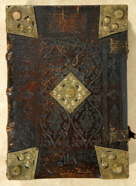 Vol. I (PML 63245): Contemporary blind-tooled pigskin stained dark over beveled wooden boards (30.7 x 21.5 cm), sewn on 3 supports, bound in Nuremberg by the Augustiner workshop (Augustinerkloster 1. Gruppe, EBDB w000089/Kyriss 19), active 1467-1510. Two clasps. Plain paper pastedowns (manuscript waste under the front pastedown); corner and central stamped copper furniture, pierced with leaves in relief. Manuscript shelf mark label "49" on spine. Later gilt-stamped cartouche under central boss on top board and blind-stamped initials "BLA" at bottom of top board. Evidence of chain attachment on rear board.