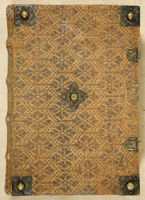 Contemporary (French?) brocade cloth over wooden boards (30 x 20.5 cm.), sewn on 4 supports, bound for Budé. Plain vellum pastedowns; braided decorative endbands. Stamped brass bosses and two pairs of brass clasps and catches.