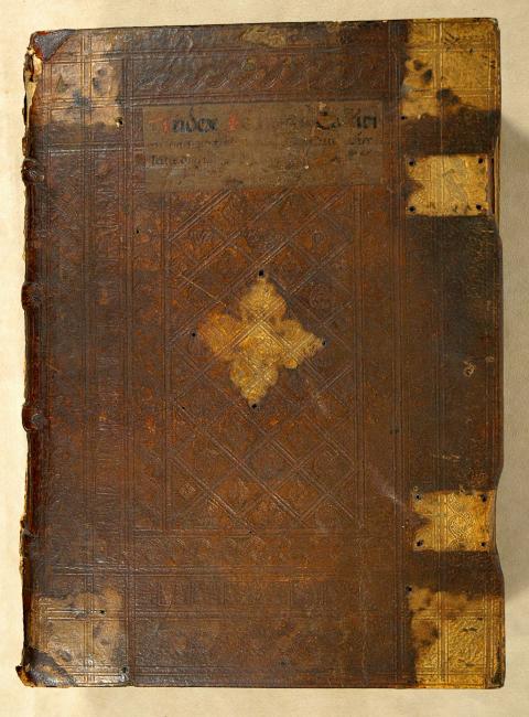 Contemporary Austrian blind-tooled pigsking over wooden boards (40.5 x 30 cm), sewn on 4 supports by the Dominican convent in Vienna (EBDB w002390, active 1453-86, also know as Wien Dominikanerkloster or Predigerkloster); repaired. Plain endbands. Paper title label on top board. Furniture and 2 clasps, missing; former chain attachment on rear board.