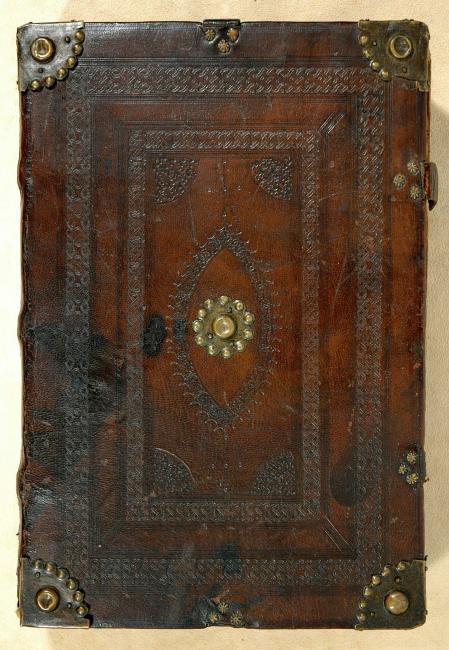 Contemporary Italian blind-tooled brown goatskin over wooden boards (32 x 22 cm), sewn on 3 supports. Corner and center bosses; 4 clasps, 2 wanting. Plain paper pastedowns and fly leaves; plain endbands.