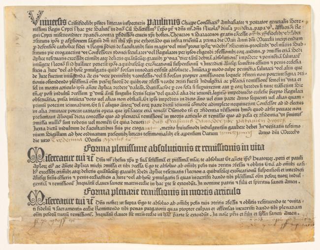 OC card title: "[Indulgence, (granted by Nicolaus V), and issued by Paulinus Chappe, proctor-general of the King of Cyprus, to contributors to the war against the Turks].