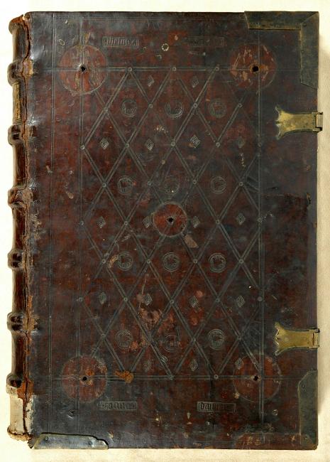 Contemporary German blind-stamped calf over wooden boards (42.5 x 30 cm), sewn on 6 supports by the Benedictine monastery of Liesborn (Liesborn Benediktinerkloster, EBDB w000151, active 1469-1516). Vellum music manuscript pastedowns, with renewed paper front endleaf; sprinkled edges. 2 clasps and metal corner pieces, chain hasp attached to rear board; 5 bosses missing from each board