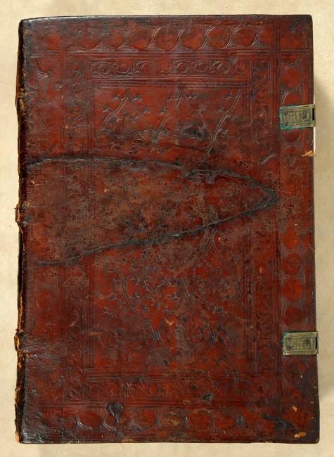 Contemporary blind-stamped calf over wooden boards (31.5 x 22), sewn on 3 supports by the Augsburg Blüte frei workshop (EBDB w000899/Kyriss 77, a.k.a. Augsburg Bogenfries workshop), active ca. 1477-1497; repaired by Duprez Lahey. Plain paper pastedowns, front pastedown and rear fly leaf from Breviarium Augustanum (Augsburg) printed by Albrecht Kunne (ISTC ib01146800). 2 clasps, straps wanting.