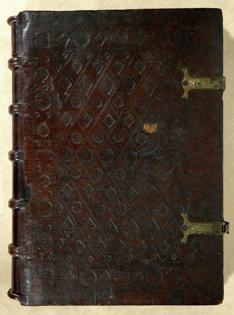 15th-century German blind-stamped calf over wooden boards (40.5 x 29 cm), sewn on 5 supports, bound in Coesfeld (Coesfeld I-O workshop (Münster Fraterhaus), EBDB w000204, active 1470-80); repaired and rebacked. Modern pastedowns with previous pastedowns as endleaves; previous spine covering preserved in rear pastedown. 2 clasps.