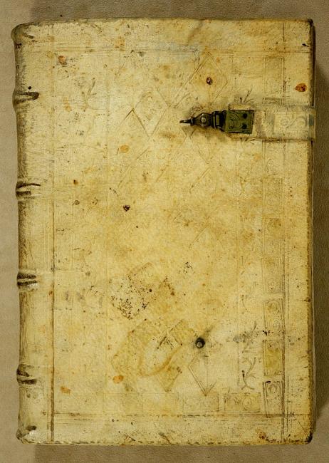 Contemporary blind-stamped pigskin over wooden boards (30.5 x 21 cm), sewn on 4 supports by the Kapuziner workshop in Bamberg (EBDB w002896/Kyriss 126), active ca. 1466-1479. Plain paper pastedowns; braided leather endbands. 2 pin-clasps, 1 wanting.