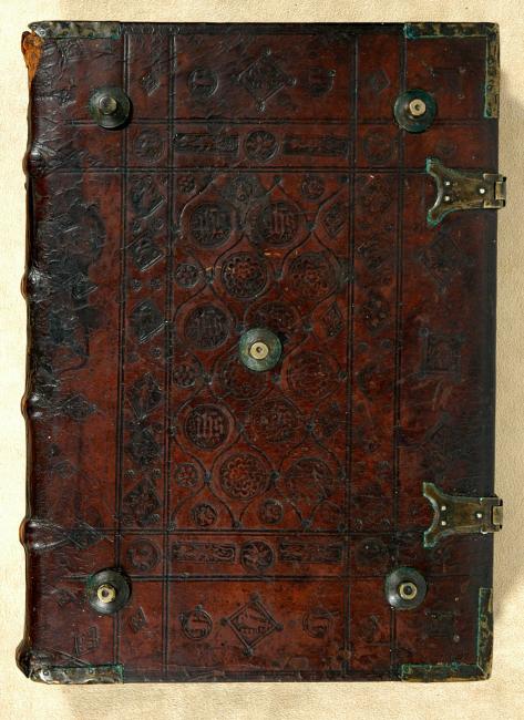 Contemporary blind-stamped leather over wooden boards (29.3 x 20.8 cm), sewn on 4 supports, bound by the Christuskopf workshop at Hildesheim (EBDB w000207); rebacked by Duprez Lahey. Plain parchment pastedown (front) and liturgical manuscript bifolium waste, late-14th/early-15th century (rear) with plain parchment fly leaf (front); plaited endbands. 2 clasps with Y-shaped catches; 5 cardinal's hat bosses per board and flower-shaped chain attachment on top of rear board; metal corner reinforcements. Fore edge tabs for individual works.