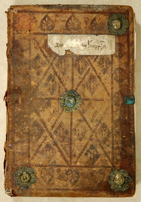 Contemporary blind-stamped calf over wooden boards (31.5 x 21 cm.), sewn on 3 supports by Ambrosius Keller in Augsburg (EBDB w0000325/Kyriss 49). Contemporary plain paper pastedowns (leaves [2]/1 and [18]/8 used as front and rear pastedowns); plain, unwrapped endbands. 1 clasp, wanting; 4 corner and 1 central bosses on each board, floral-shaped flange with domed center. Paper title label on front board.