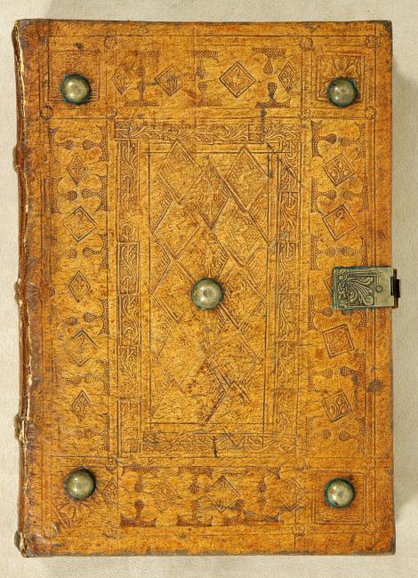 Contemporary blind-stamped pigskin over wooden boards (30 x 21.5 cm.), sewn on 3 supports by the Dominican bindery at Eichstätt (EBDB w000065/Kyriss 9), active ca. 1472-1536. Plain paper pastedowns and front fly leaf; edges colored yellow. Manuscript music leaf used as reinforcement under pastedowns. 1 clasp, with engraved foliate pattern on brass plates. Simple brass domed corner and central bosses on each board.