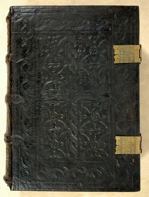 Contemporary blind-stamped calf over beech boards (31 x 22 cm.), sewn on 5 supports (Kapitalbund?) by the Lambach Benediktinerkloster workshop (EBDB w002363), active ca. 1443-1500; repaired by Duprez-Lahey. Former pastedowns removed, manuscript offset on inside of boards. 2 clasps, with blind-stamped leather straps; brass attachments stamped with "maira" [sic].