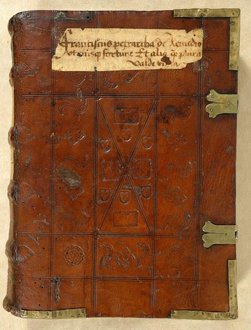 Contemporary blind-tooled calf over wooden boards (29 x 21 cm) by Pancracius Hochberg (a.k.a. Pancratius) in Basel (EBDB w000061; Kyriss 57). 2 clasps, straps wanting, and brass corner strips. Plain paper pastedowns; decorative endbands. Manuscript title label: "Franciscus petrarcha de Remedio utriusq[ue] fortune Et alia q[uam] plura valde v[?]ia." 4 spine labels: 2 gilt-stamped leather title labels, a paper label "Sine Anno. Seac: XV.," and a partially-removed gilt-stamped leather label (former shelf mark?).