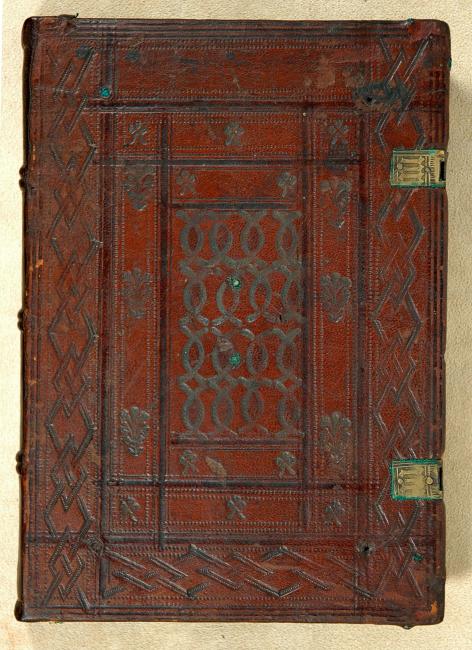 Contemporary German blind-stamped calf, probably bound in Regensburg, with tools similar to those of Knoten III, also know as Regensburg Knoten (EBDB w000020/Kyriss 153).