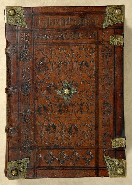 15th-century German (Augsburg) blind-rolled dark-brown calf (or sheepskin?) over wooden boards (33.5 x 23.5 cm), sewn on 4 supports, bound by the Jagd-Rolle IV workshop (EBDB w001516/Kyriss 88, active 1478-1514, also known as Blattwerk-Ornament). Plain paper pastedowns; plain endbands; yellow edges. Fragments of medieval manuscript used as binding reinforcements. With cornerpieces and center bosses; 2 clasps, missing (catch plates present).