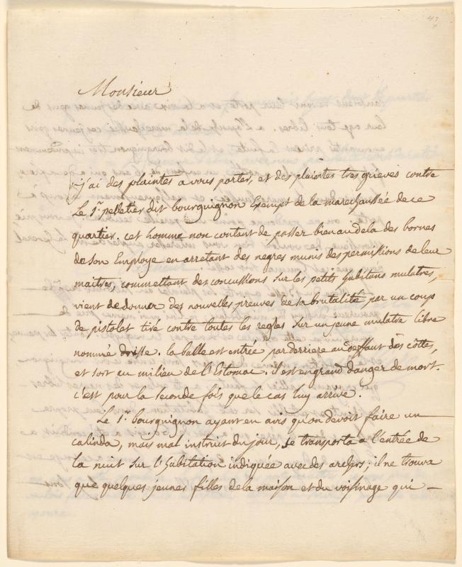 Reporting on the actions of a local police officer named Pelletier (also known as the Bourguignon); writing that Pelletier has been aggressively arresting and extorting Black and mixed-race people in the area; saying that Pelletier has now shot and seriously wounded a free mulatto boy named Drisse, and that this is the second time Pelletier has shot someone; describing in detail the circumstances of the attack; adding that the injured sixteen-year-old has two brothers who are police officers; asking the recipient of the letter to appeal to the General to relieve Pelletier of his duties; writing that the boy's mother has filed a complaint with the deputy royal prosecutor in Mirebalais, and La Martillière has followed up, urging that the case be pursued; saying that, to place the blame elsewhere, Pelletier has arrested some free Black individuals residing in the area, along with their sixty-year-old father, and brought them to court; adding that the entire quarter wishes to be rid of Pelletier.
