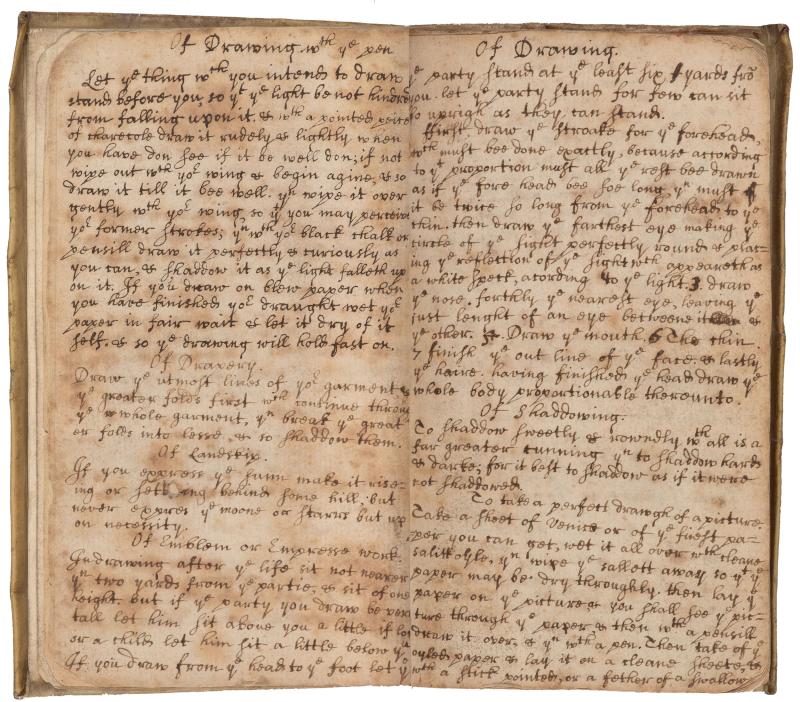Being a memo book, written on the rectos and versos of 47 leaves, signed and dated 1659 on the first leaf; written in two parts, the first of 46 pages from the front of the book forward and the second, comprised of 48 pages, written by turning the book over and starting from the opposite end of the book; the first half of the memo book contains small essays on drawing, recipes for remedies for ailments, short descriptions of "Certain Tricks," several calendars and astronomical tables; the second half begins "The several things contained under their general heads" and the lists that follow are arranged by chapter and then alphabetically within a chapter, beginning with "Arts, Trades and Sciences / Chap. 1," continuing through Birds, Beasts, Clothes, Of a Church, through to Chapter 16, Minerals; the final six pages begin with a pronunciation guide to the English alphabet and end with two short letters to "Loving Friend", the first in the spelling of the period and the second, the same letter with its euphonical spelling as per his guide.
