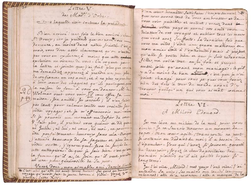 An autograph fair copy made by Rousseau for the printer Marc-Michel Rey in Amsterdam, with some minor corrections, revisions and additions throughout. Bound in two volumes: parts 1-3 (paginated by Rousseau 1-3 (preface); 1-196; [1] (title page for part 2, signed); 1-144; 1-139) in vol. 1; and parts 4-6 (paginated by Rousseau 1-191; 1-161; [1-3] (preface); 1-159) in vol. 2. Each part is titled "Lettres de deux amans, habitants d'une petite ville aux pieds des Alpes." A later hand has added "La Nouvelle Héloïse" to p. 1 of vol. 1.