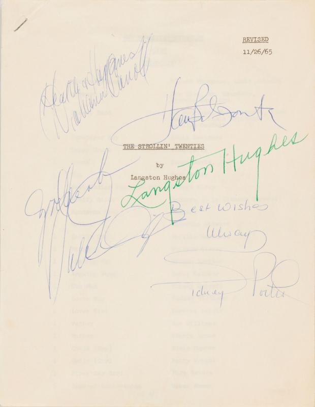 The title page is signed by Harry Belafonte, who created and produced the television special for which this is the script; Langston Hughes; and three members of the cast, Diahann Carroll, Duke Ellington, and Sidney Poitier. Other cast members included Sammy Davis Jr., Hank Jones, Paula Kelly, George Kirby, Gloria Lynne, Brownie McGhee, Nipsey Russell, and Joe Williams.