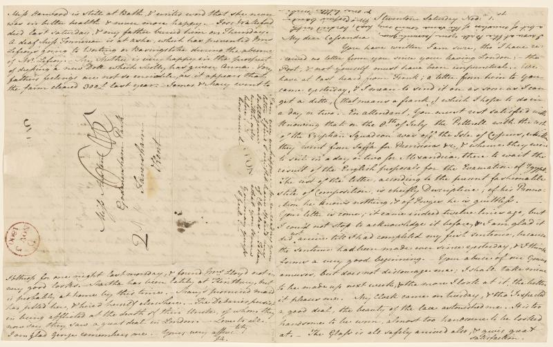 With postmark, addressed to Miss Austen, Godmersham Park, Faversham, Kent; seal cut out.
