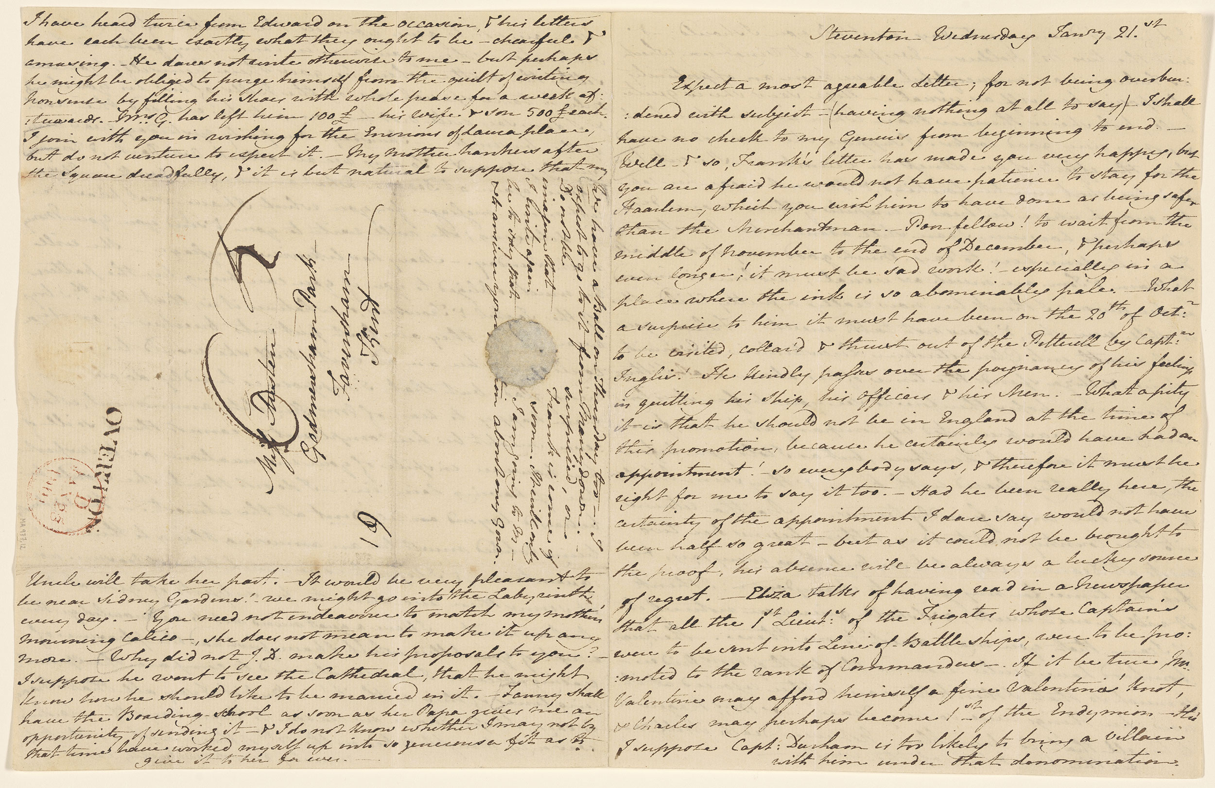 With postmark and mark of wafer, addressed to Miss Austen, Godmersham Park, Faversham, Kent.