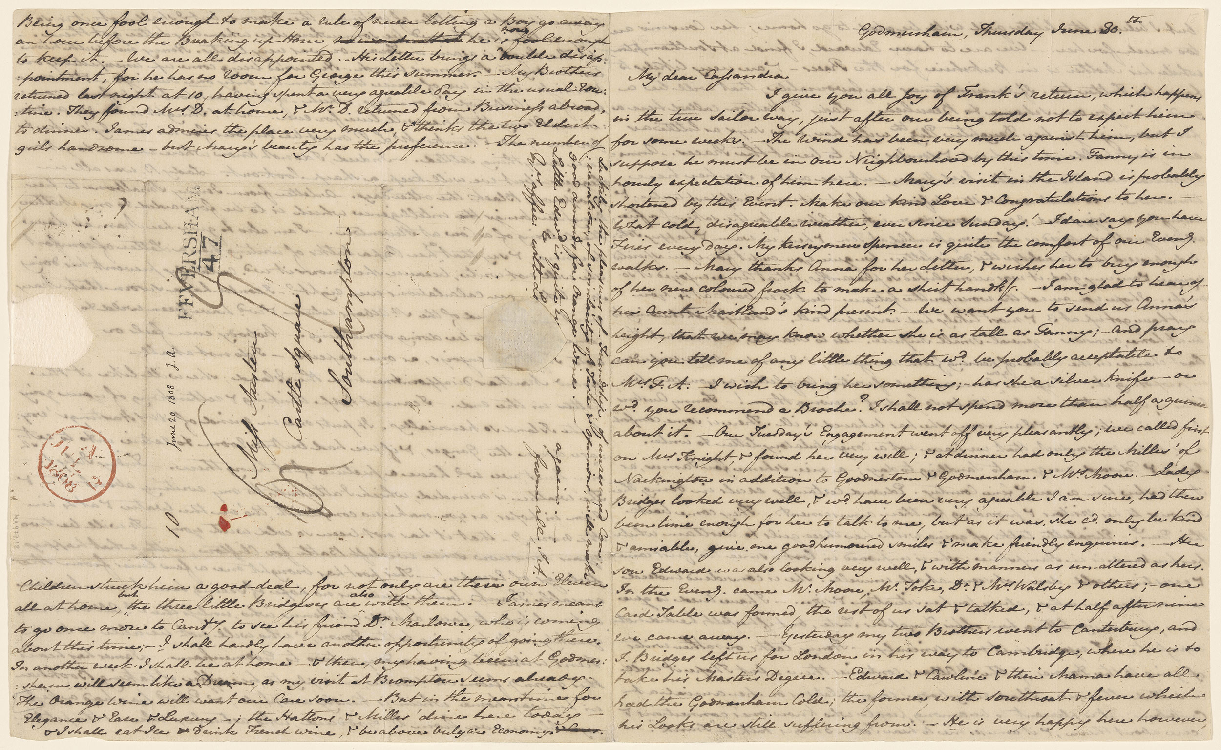 "June 20,1808 J.A." is written above the address in what could be Jane or Cassandra Austen's hand.