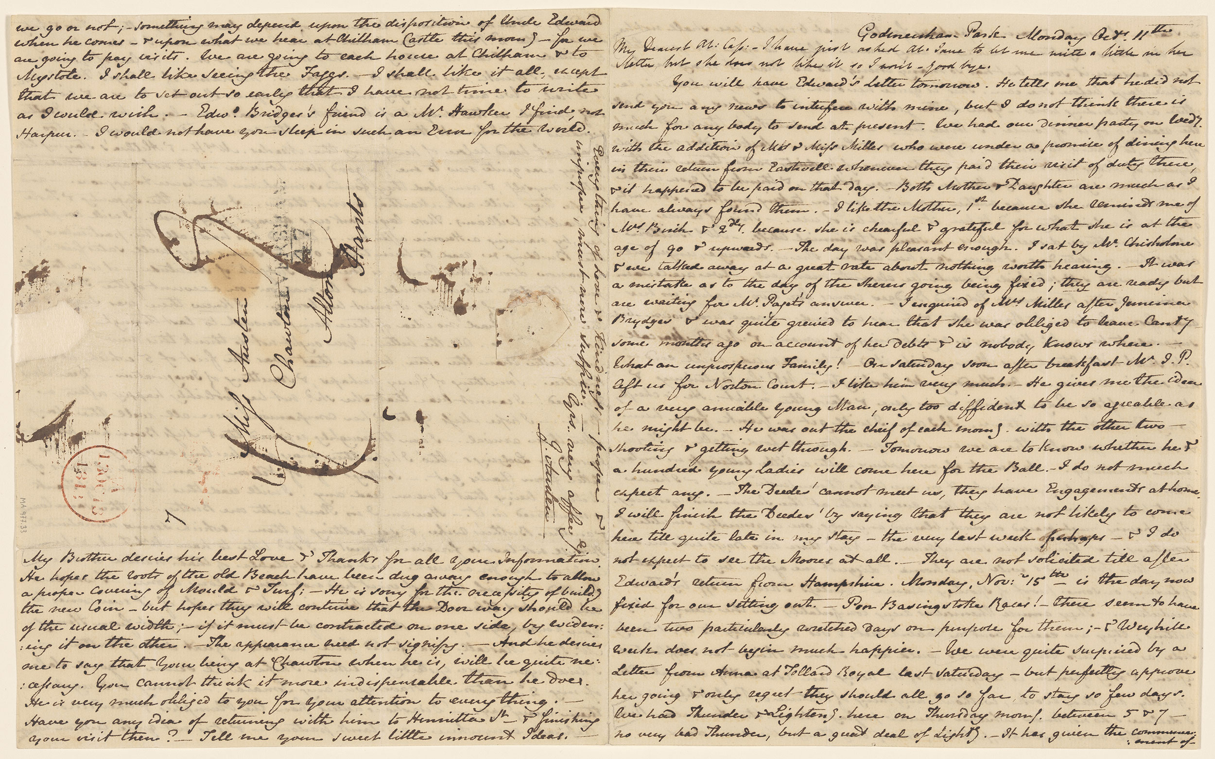 With postmark and wafer, addressed to Miss Austen, Chawton, Alton, Hants [Hampshire].