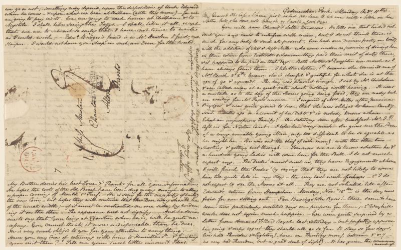 Includes two lines between the date and the salutation: "My dearest At: Cass -- I have just asked At: Jane to let me write a little in her letter but she does not like it so I won't -- good bye." This is probably in the hand of Edward Austen's daughter Fanny.