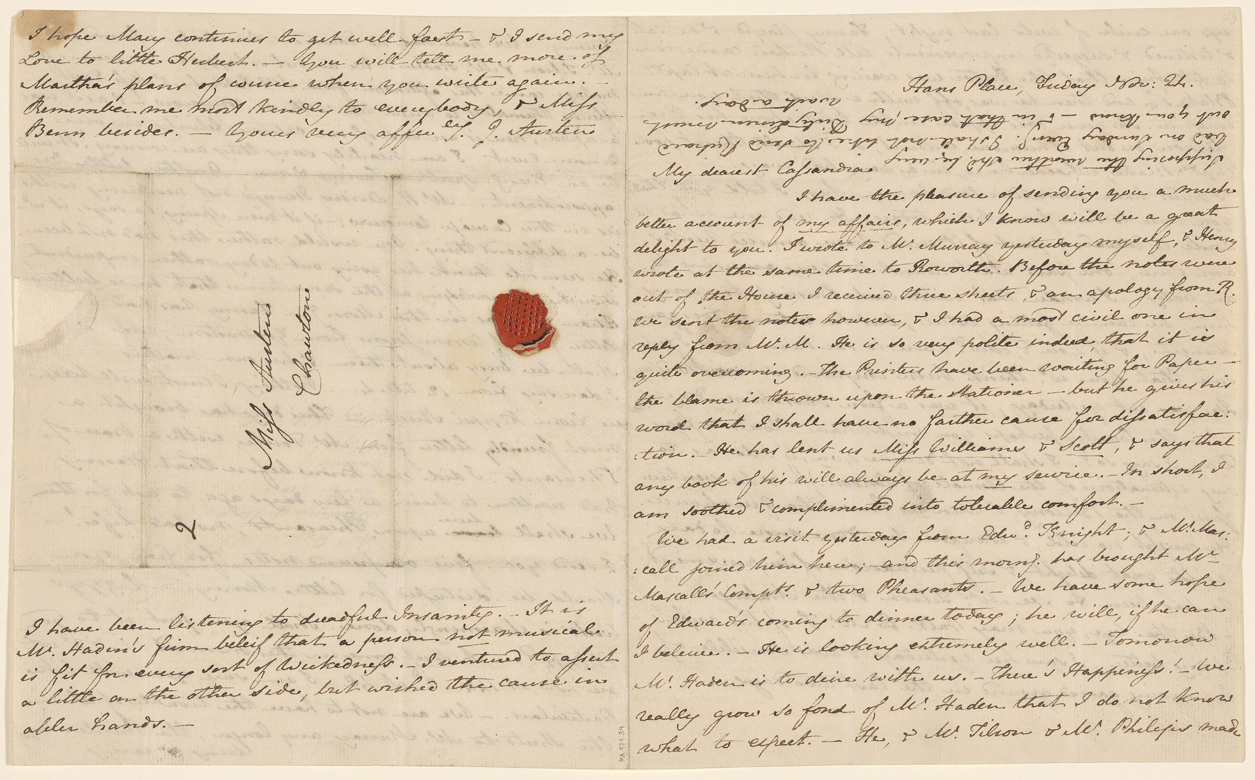 With red wax seal, addressed to Miss Austen, Chawton; written from Hans Place.